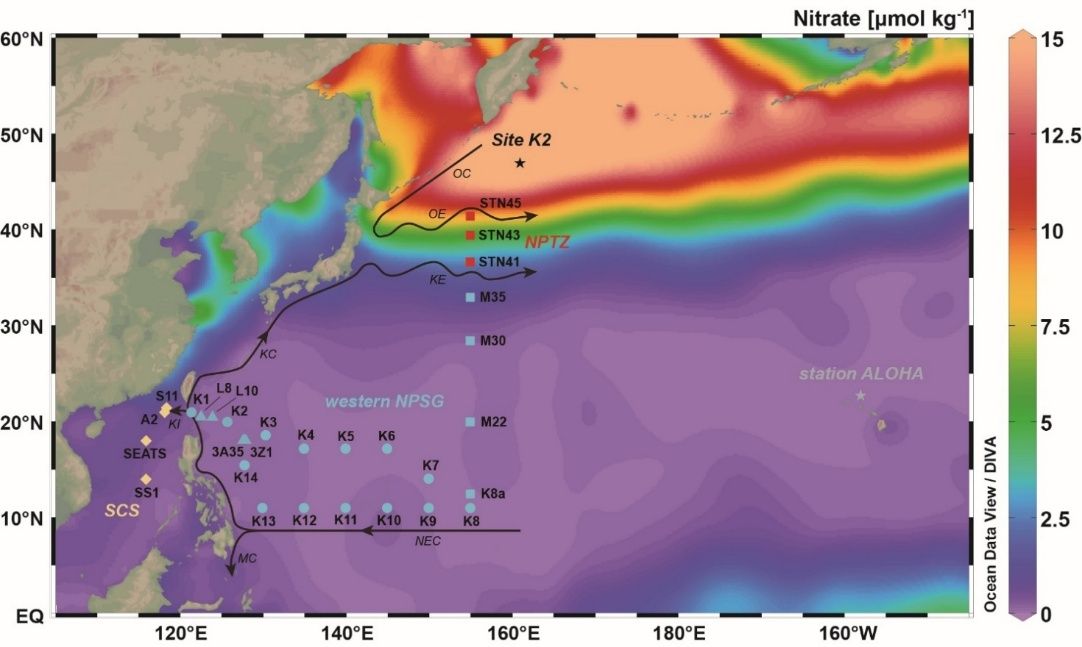 图1. 西北太平洋航次颗粒钡采样站位。站位覆盖西北太平洋副热带流涡区(western NPSG)、北太平洋过渡区(NPTZ)和南海(SCS);K2站(Site K2)和ALOHA站(station ALOHA)为文献对比站位,背景为表层硝酸盐浓度
