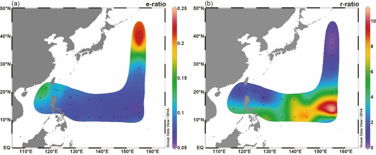 图4. 西北太平洋及南海真光层有机碳输出效率(e-ratio)和弱光层有机碳再矿化率(r-ratio)的空间分布