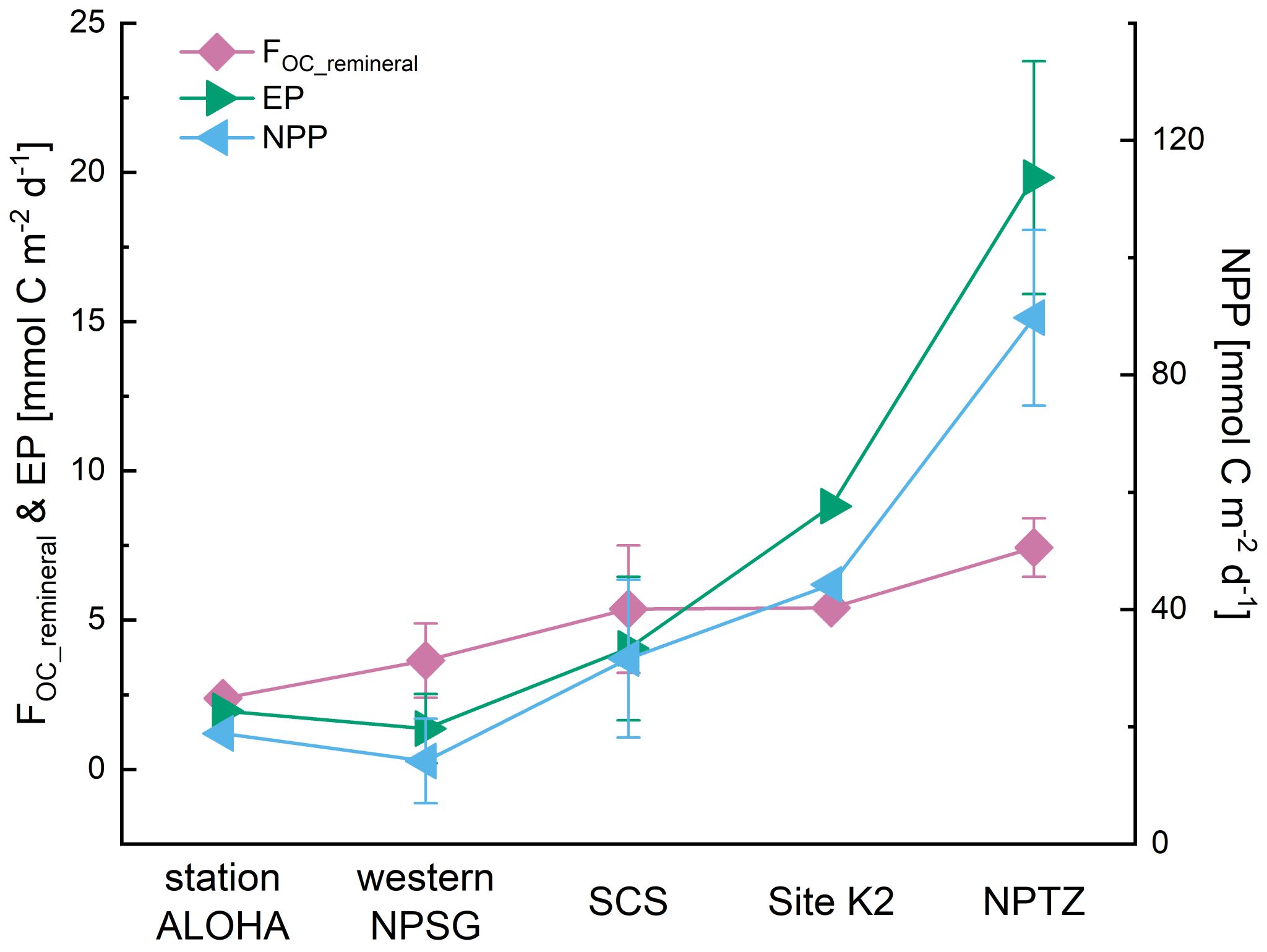 图3. 北太平洋各区域弱光层有机碳再矿化通量(FOC_remineral)、真光层净初级生产力(NPP)和有机碳输出通量(EP)